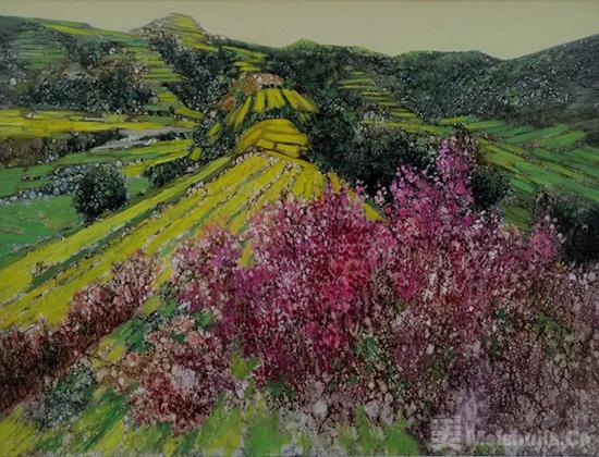 他構思精巧,技法精湛,將北方塞上的蒼涼雄渾、江南水鄉的溫婉秀美、表現得入木三分,意蘊生動,融中國畫的意境氣韻于油畫的技法中。他的畫作,用特殊的灑點法,呈現出光怪陸離、斑駁繁雜的肌理效果,對樹木、花草、溝壑的表現恰到好處,讓觀者不由自主地沉浸在他所營造的意境之中。他的畫面表現色彩并不豐富,卻賦予了作品強烈的視覺沖擊力,同時也不失細膩與柔美。