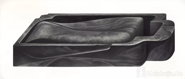 我笑稱他在玩“法西斯美學”,不料大經接著畫出了硯臺系列,令我愕然。第一次,統轄他的素描王國的不再是均質的灰度,這組素描硯臺的濃黑——可能用了炭筆——如其質地本身,密實而沉默,同時,亦如濃煙,輕盈、冷漠、神秘,乍一看,有悸怖之美,而且,老天爺,居然極度斯文,近乎極簡主義的室內修辭。其中一枚硯臺的臺面,皺起波紋而中間下陷,成為突兀而優美的凝固幻象。現在我無法分辨是素材戰勝了媒介,還是媒介制伏了主題。我立即認出這是硯臺,但大經將之提升為大幅的素描。我不知如何解釋這“提升”,因為我沒見過這樣的素描——至少,沒見過墻磚與硯臺能夠這樣地被委身于素描,抑或,鉛筆與碳粉因之被開發了未知的潛能。