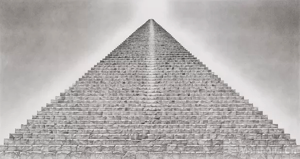 畫到大尺寸的墻磚系列,轉折出現了。當物質以超現實尺度被凸顯的同時,墻磚似乎消失了,大經讓我們忽略對物象的辨認,最大限度看見了他的“素描”。是的,那不再是金陵的墻磚,而是“素描”。然而鉛筆的“縱欲”功能,仍被滿足:細節、質地,驚人地逼真,湊近看,鉛筆的欲念滲入墻磚的每一豁隙、裂痕、糙面,還有遍布磚身、經已鈣化的早古苔蘚(我不知道大經是否動用了鉛筆的所有型號)。但素描的功能,被翻轉了——越看越多的苔蘚、糙粒、裂痕、豁隙,分明不是在訴說磚體的質地,而是,鉛筆的神效。被籠罩在統一的鉛灰色效果中(從接近紙白的輕敷,到凝著銀光的陰影),奇異的是,墻磚系列看上去有如抽象畫。人畫出作品,會被作品漸漸引領。我以為大經到這一步,該是他的極限了。在下一個驚奇之前,似乎作為例外,他畫了一組虛擬的“形狀”:也許有上百個方型的立柱,漸次堆疊,形成介乎山岡與金字塔的景觀,未經畫出的光源在柱形間投下參差而齊整的陰影,如一座初建或被劫毀的城,望之凜然(莫非這是大經自己的心像么?)。