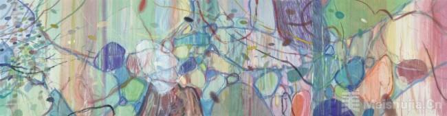 “山外”源于藝術家向外觀看的彩墨大風景系列作品,從《荒石》系列抽象表現的主觀性色彩表達,到“山外”彩墨大風景系列筆墨與線條的表現性與抽象性,黨震經歷了一個由主觀創作到寫生狀態轉換的過程。近些年來由于寫生次數和書法課徒的疊加累積,彩墨大風景的色調與線條越發自由奔放,尤其在終南山的寫生經歷使得他內心獲得了無比的從容與釋放。
