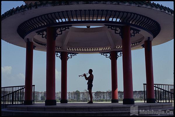 在拍攝這個項目的同時,振宇也走出了影棚,將鏡頭對準(zhǔn)鴨綠江的河岸以及丹東的街頭巷尾中的人群和風(fēng)景,于是我們看到了《東北民謠》中的那些典型的東北畫面:江邊風(fēng)中烈烈飄舞的旗幟,鐘表攤位前的踟躕的老人,以及涼亭里吹響的小號。這條國境線上的鴨綠江也帶來了一種強烈的疏離與連接同時存在的矛盾感,成為了一個融合了情感與記憶的場所。就像是段義孚先生提出的“戀地情節(jié)”,人們與養(yǎng)育自身的土地之間,生長出根系般深沉的精神連結(jié),在《東北民謠》中,我們可以看到一幅感知鄉(xiāng)土的地圖在蔡振宇的鏡頭前展開,那些在城市中成長和生活的記憶已然融入進江水和雪花。
