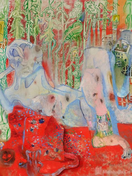 仇曉飛的藝術實踐深刻植根于個人家庭記憶及其對故鄉哈爾濱的復雜眷戀之中。這一地域經驗表現為畫布上反復出現的、由荒廢建筑與自然景觀復合而成的空間,它們在作品中宛如舞臺的背景,是其美學的核心載體。在經過對繪畫形式長達多年的淬煉后,藝術家的關切點明確轉向了對人類精神中癲狂、幻覺等非理性力量的探究。仇曉飛通過繪畫媒介渲染他對當代精神狀態的觀察,并在此過程中持續處理生長/死亡、絢爛/殘酷等二元對立關系。其作品因而成為在真實與想象間不斷催生轉化的機制,旨在挖掘潛藏于日常表象之下的暗流。