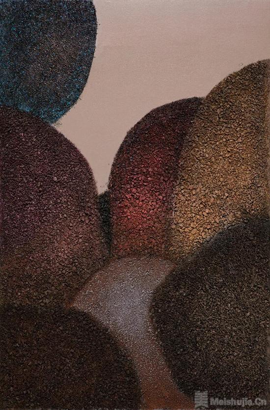 夏金旺的創作中隱隱流動著對“形”的不同理解,構成了此次展覽的內在學理線索。有時,材質的顆粒感與色溫自然契合于山嵐、云霧的詩性想象,是材質本性與東方審美之間無聲的相互指認;有時,薯莨渣滓以其不規則的橢圓形態在畫面中自我還原,藝術家近乎退出,讓物質保有被碾碎之前的最后形狀;而在更多近作中,幾何框架與有機肌理構成靜默的對峙,形在場,卻已開始隱去——“遁”不是消失,而是一種主動的精神收斂。這三種姿態并非截然分立,而是彼此滲透的內在線索,共同指向同一方向:創作主體的意志被持續懸置,物質的自我表達被持續打開。