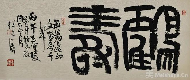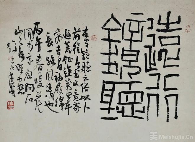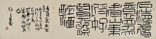 常言道:“士隔三日,當刮目相看。”徐濤君誠為此士也。近年他尤著力于大篆研習。焦黑濃重的墨線仿佛刻劃進紙面,又像商周青銅器銘上那浮起的陽文線條,真是具有強烈的金屬感和金石氣。他以行草筆意參化金文大篆與漢篆殳書,雍容疏放,古奧奇曲,一如凸凹有致的印面文字,令人稱奇。徐濤君之行草完成了從碑學向帖學的華麗轉身。我曾見其臨寫的《唐人摹萬歲通天帖》的王氏一門書,頗具東晉風度。而近期其行草,氣息古雅內斂,瀟灑從容,更獲精進,毫無一點碑派書家在點線上的滯澀和造作。