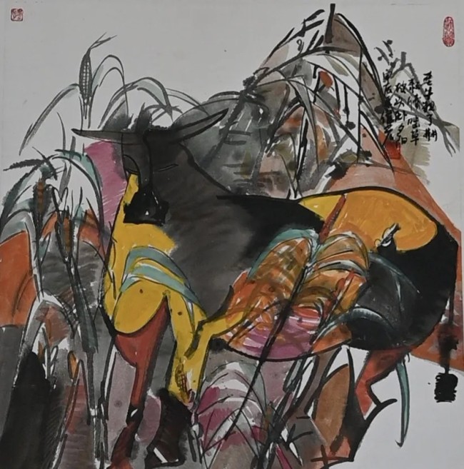 畫家匡偉光作品的語言形式,體現(xiàn)了當(dāng)代性新美學(xué)意識,充分表現(xiàn)了當(dāng)代藝術(shù)的語言特征。他在研究借鑒了野獸派、立體派、印象派等語境詞匯后,以自我為中心的立場感知,將畫面布局分割,色彩對比構(gòu)成,意象變形夸張,主題隱喻象征,視覺賞目寄情,讓人聯(lián)想到畢加索、雷諾阿、安德烈洛克、弗朗西斯畢卡比亞等人的畫風(fēng),這是繪畫語言風(fēng)格的探索與突圍,而內(nèi)容或者說取材卻是中國式的主題。從畫面中可以看到詩經(jīng)的場景、禪宗的縮影、古詩的意境、神話的傳說,表現(xiàn)最多的題材則是更適合繪畫語言造境、充滿佛意禪境的作品,縹緲虛幻如夢,個別作品具有裝飾的意趣,夸張、變形、充滿張力。例如具有戲劇臉譜意味的人物造型,熱烈而奔放,雖然看不到皴擦點染、線與墨的痕跡,但是畫面?zhèn)鬟f的信息無疑是中國風(fēng),這就是所謂的“古典”。古典不是方法,古典是精神。畫家匡偉光的作品是富有當(dāng)代性語言的繪畫作品,任何語言都是工具,藝術(shù)作品的生命就在于利用語言工具表達(dá)了什么,這就是藝術(shù)作品生命力的所在。這種生命力就是中國藝術(shù)精神,來自民族文化的自信與文化的歷史淵源。
