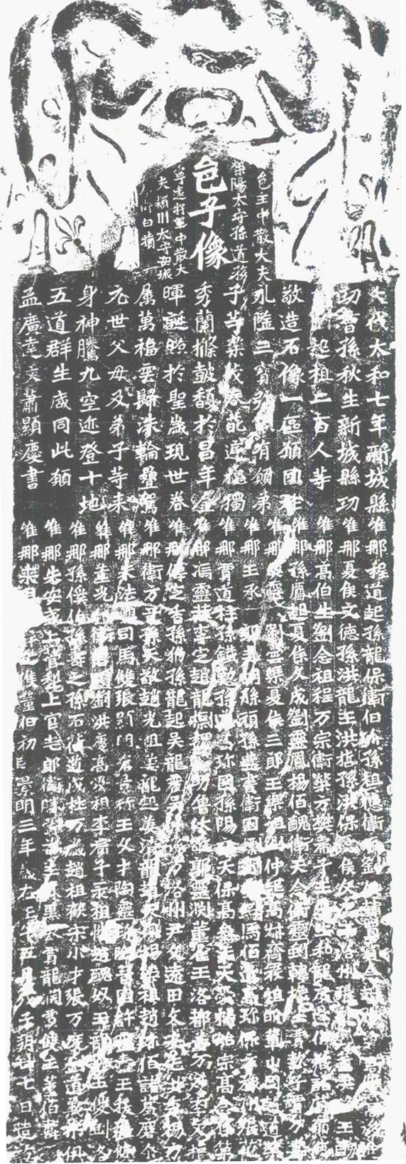 孫秋生造像記》,全稱《孫秋生劉起祖二百人等造像記》,在洛陽龍門石窟古陽洞南壁。北魏宣武帝(元恪恪)景明三年(502年)五月廿七日造訖。此碑書犀利剛勁,寬博樸厚,較《始平公造像》筆法多變,龍門二十品之一。孟廣達文,蕭顯慶書。楷書十五行,行三十九字。字體方勁峻拔,沉著勁重。筆法凝練自如。