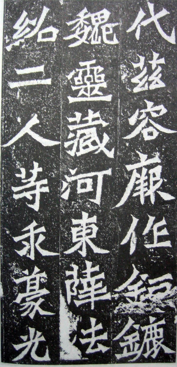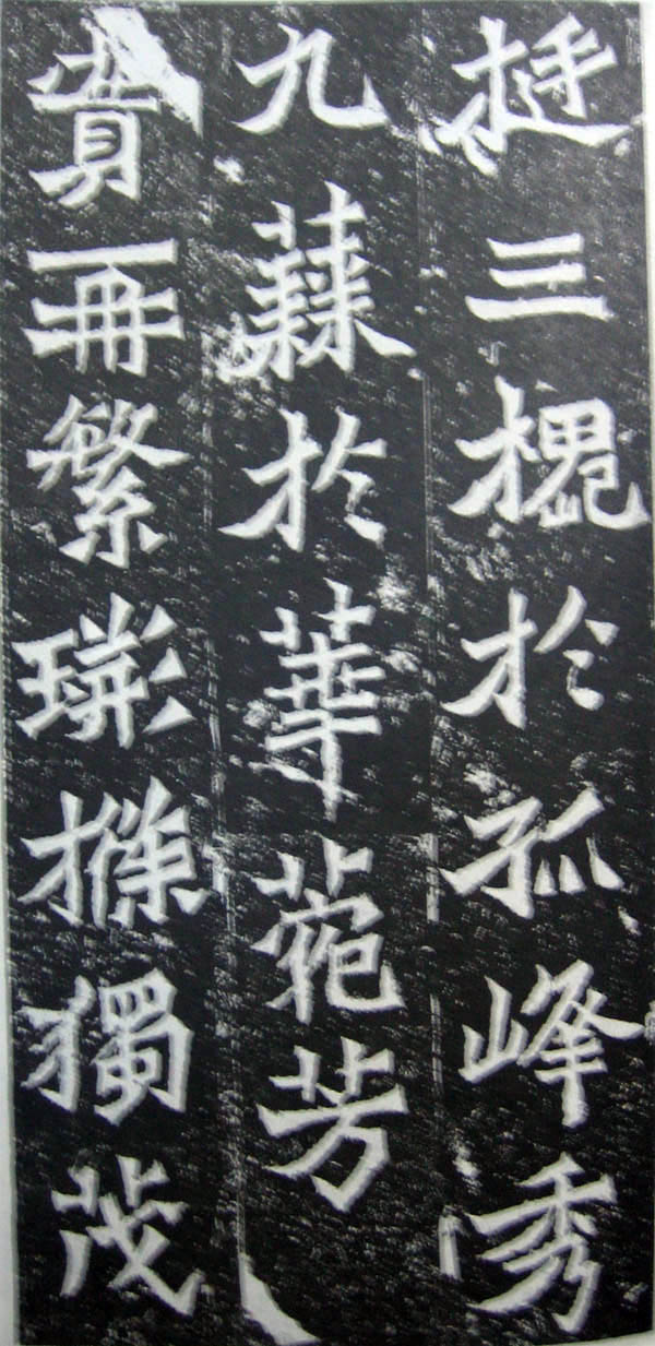 此碑應是方筆露鋒之典型代表,因此最顯見用筆之妙。起筆都將鋒穎露在畫外,有的角棱若刀,有的細鋒引入,煞有情趣;即使畫也挺直有力,折筆顯見方棱;收筆處,有時斂毫便止,有時放鋒犀利,有時如《寶子》之上揚。筆畫或大或小,大者縱矛橫戈,如虎奔龍吟,小者輕微一點,如蜻蜓掠水,皆能順勢合情.絕無率意輕發。結體或取橫勢,或取縱勢,皆極意顯示雄踞盤關之威儀,懷隱瑰玉之神采。整篇看來,嚴整肅穆,端莊雋潔。