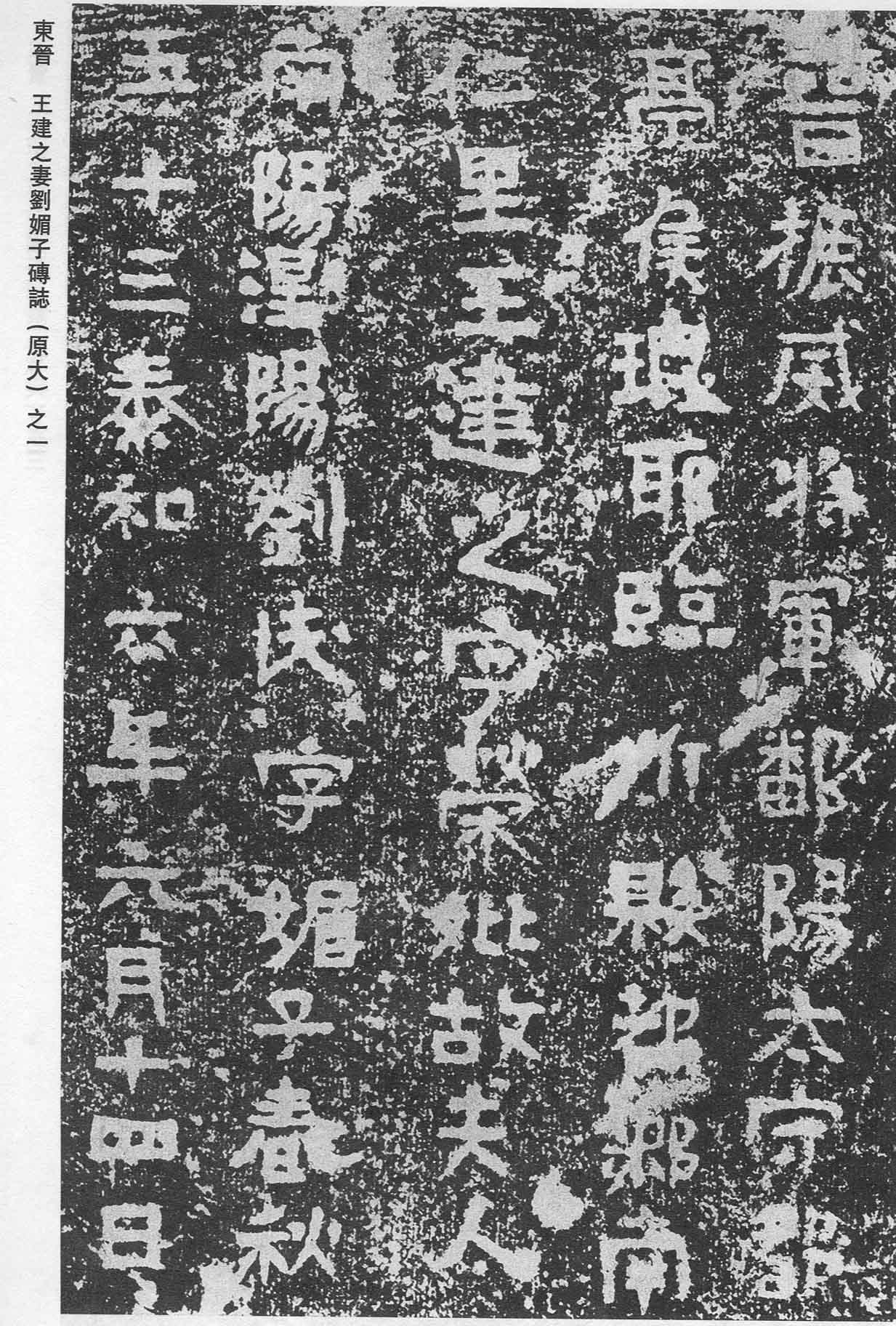 1998年9~12月,南京市博物館在該市北郊的象山發(fā)掘了3座東晉瑯琊王氏家族墓葬,發(fā)掘簡(jiǎn)報(bào)刊載《文物》2002年第7期,并且披露了4方墓志的拓片。其中編為9號(hào)的夫妻合葬墓保存完好,從中出土了3方墓志,有2方為石質(zhì)墓志,發(fā)現(xiàn)于墓室內(nèi)死者頭部,一為王建之墓志,一為王建之妻劉媚子墓志;另一方為磚質(zhì)墓志,發(fā)現(xiàn)于墓坑填土中,亦為劉媚子墓志,其基本內(nèi)容與石志相同而文字稍簡(jiǎn)略,估計(jì)是“為了日后合葬時(shí)便于尋找而有意設(shè)置的”。王建之其人于史無(wú)徵,據(jù)其墓志云:“晉故振威將軍、鄱剛太守、都亭侯,瑯耶臨沂縣都鄉(xiāng)南仁里王建之,字榮妣,故散騎常侍、特進(jìn)、衛(wèi)將軍、尚書左仆射、都亭肅侯彬之孫,故給事黃門侍郎、都亭侯彭之之長(zhǎng)子?!笨芍ㄖ疄橥醣虻膶O子,襲封都亭侯。王建之的妻子劉媚子亦不見(jiàn)于史傳。 該碑書體介于隸楷之間,橫畫雖有波挑,但波挑收斂,體勢(shì)明顯具有一定楷書的特點(diǎn)。其中有的字隸意濃厚,與漢隸十分相近。又有個(gè)別字具有明顯仿古的篆書遺意,極富有裝飾性,實(shí)屬罕見(jiàn)。