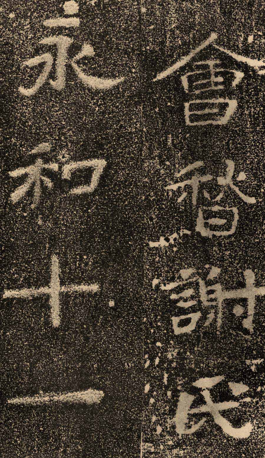 《謝氏墓志》與《高崧墓志》相比,在書法上率意自然成份較大,如開頭“鎮(zhèn)西”兩字明顯大于其他字,“西”字尤為出格,刻的也比較馬虎,但書法整體有一股拙樸的古意,亦不失為一種審美風格。此墓志中“稽”字為別字。