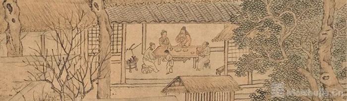 身為技藝全面的宮廷畫家,李世倬在這幅畫里特意褪去了宮廷工麗感,盡顯市井生活的樸素本真。畫面中,農家的日常鮮活生動:茅舍內,老少圍坐于矮桌旁食粥,陳設簡單卻暖意融融。不遠處的廚房里,一個婦人正在灶前準備餐食。屋外的土路上,男子抱著剛拾來的柴火匆匆走向灶臺……畫面滿滿的煙火氣。背景里,松柏枝干枯勁如鐵,雜木枝條峭利似劍,畫家以蒼秀的筆墨勾勒出隆冬的清寒,卻恰恰襯得前景里粥碗的溫熱、家人圍坐的暖意愈發動人。