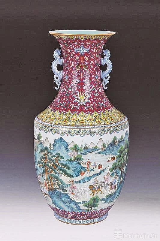 記者來到瓷尊如今的“家”——景德鎮中國陶瓷博物館。移步近觀,只見它以粉彩裝飾為主,口沿描金,其下繪黃地如意云頭紋。頸兩側各置一螭耳,洋紅地為釉色基底,繪纏枝蓮紋、蝙蝠銜環雙魚紋、佛手紋,肩部繪螭龍紋。腹部通景繪“萬國來朝”圖:城門前、小橋上和山路上,異域裝扮的使團隊伍絡繹不絕。首領身騎寶馬、瑞獸,隨從們車推、手持或肩挑著沉甸甸的外邦貢物,其中不乏紅珊瑚、如意、香爐、寶劍等奇珍異寶,琳瑯滿目。