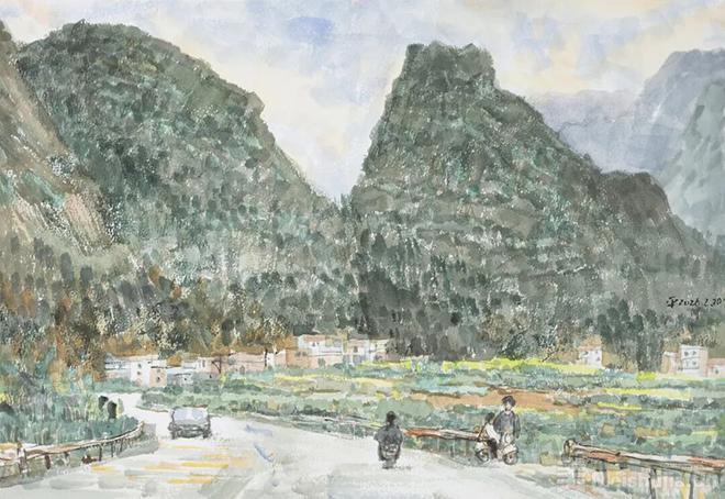 老家是一個(gè)美麗的小山村,植被良好,鳥語花香。我在房間里架了一個(gè)簡(jiǎn)陋的畫桌,拉了一個(gè)大燈泡,白天就在房間里對(duì)景寫生,晚上根據(jù)手機(jī)里的素材搞創(chuàng)作。山里氣候變化大,今天還是艷陽高照,明天卻是云霧繚繞,從窗口望出去,只見山影綽約,樹木婆娑,剛犁過的土地呈現(xiàn)深沉的鐵紅色,一壟壟紅土整齊排列,就像壯錦上的圖案一般漂亮;沒犁過的地里已經(jīng)長(zhǎng)出翠綠的嫩芽,那是去年收獲時(shí)掉下的種子已經(jīng)蘇醒。山上的小鳥感知到春天的氣息,嘰嘰喳喳地叫個(gè)不停,山谷間回蕩著歡快的旋律。嬸婆已經(jīng)按捺不住對(duì)豐收的渴望,年初一一大早就拉著小推車,在自家地里播種玉米。好一幅《人勤春早圖》!