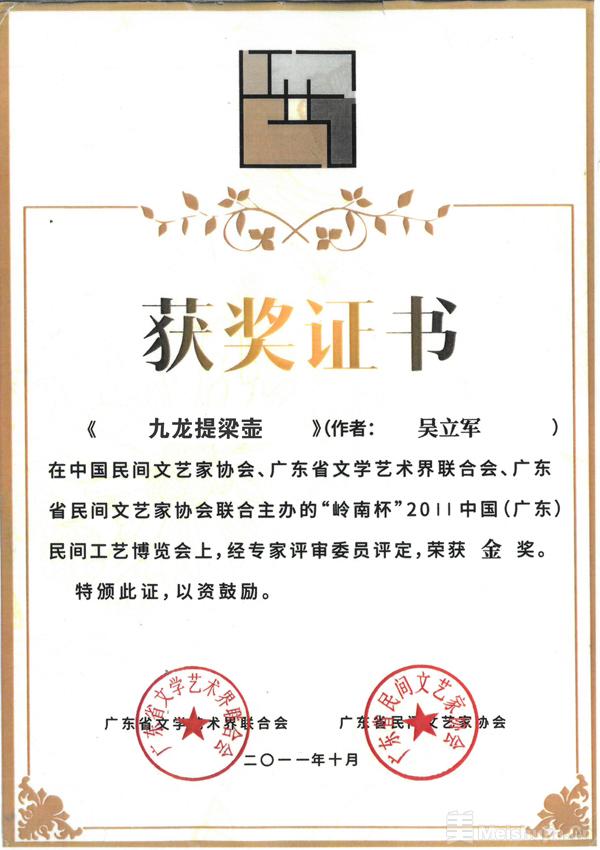 在由中國民間文藝家協(xié)會、廣東省文學藝術聯(lián)合會、廣東省民間文藝家協(xié)會聯(lián)合主辦的“嶺南杯”2011中國(廣東)民間工藝博覽會上,宜興紫砂藝術家吳立軍創(chuàng)作的《九龍?zhí)崃簤亍罚瑧{借精湛工藝與獨特藝術神韻,經(jīng)專家團嚴格評定,榮獲本屆博覽會金獎。