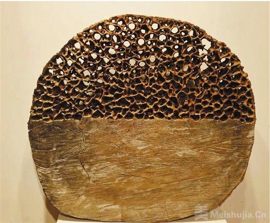 “每一根木頭皆有其生命。”也正因此,錢云可始終在尋找一種最佳的表現(xiàn)方式,同時(shí),把某一工具的使用發(fā)揮到極致,也是他對(duì)木頭的尊重。“這些年,我深挖木頭自然形態(tài)中的抽象元素,也盡可能地推敲某種形式語言的構(gòu)圖,甚至把某一單調(diào)的造型或肌理無限蔓延。”錢云可說,他醉心于雞冠花的褶皺,也癡迷于絲瓜藤的經(jīng)脈;欣喜壘薪后的肌理,更熱衷于千刀百斧后的重生;感嘆人為在自然中留下的印記,執(zhí)著于木料與生俱來的堅(jiān)韌。也正如他所說:木不在粗,可以鏤刻;紋不在密,可以磨琢;形不在繁,可以達(dá)意。