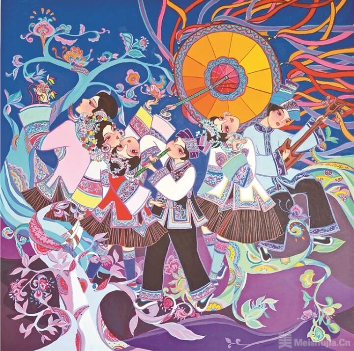 2018年,我帶著作品《慶豐收》參加培訓,在老師的悉心指導下反復打磨,沒想到這幅畫竟然入選了2018全國農民畫優秀作品展。那一刻我激動得說不出話,眼淚都快掉下來了——原來我這樣一個普普通通的農村婦女,也能畫到全國的舞臺上!從那以后,我更堅定了一輩子畫農民畫的決心。2021年,我創作的《蘆笙響起來》入選中國美協等單位主辦的“幸福小康