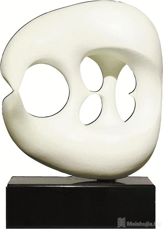 這是一件為數(shù)不多的僅以幾根線條就勾勒出豐富動(dòng)態(tài)意境的作品。雕塑是空間藝術(shù),如果用線條去闡述,往往是因?yàn)檫@件作品對(duì)形體做了極度凝練的概括,這也是《飲水的熊》映入眼簾的氣質(zhì)。線構(gòu)成“形感”——即形態(tài)的感受,是造型藝術(shù)最初也是最本質(zhì)的要素。作品的形感從抽象藝術(shù)的路徑切入,但并不以空洞的概念化的方式去塑造。熊飽滿的身軀,粗短的四肢,都被微妙地塑造出來(lái),顯示了作者對(duì)形態(tài)極強(qiáng)的概括能力。同時(shí),線完成抽象形態(tài)的串聯(lián):作者把熊的頭部接觸水面的一瞬間凝固,將熊的本體與水中的倒影都做了實(shí)體化處理,上下兩個(gè)鏡像的輪廓融為一體,構(gòu)成近似圓形的完整形態(tài)。這件作品在60厘米見(jiàn)方的體量?jī)?nèi)完成,前后縱深還不到30厘米。作為小尺寸架上作品,空間關(guān)系為主導(dǎo)輪廓線條的變化,因此對(duì)雕塑空間的把握和處理,影響著整件作品的藝術(shù)效果。
