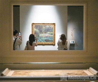 策展團隊巧妙運用場景設計,帶領觀眾進入“造園”“游園”和“賞園”三重意境,展品涵蓋繪畫、版畫、漆器、雕塑、陶瓷器、玻璃器等。北京故宮博物院珍藏的明代文徵明《蘭亭修禊圖》,重現東晉王羲之筆下傳頌千古的蘭亭雅集情景;《避暑山莊圖》則融合了青綠山水與西洋透視技法,體現了清代皇家園林氣派。美國芝加哥藝術博物館展出畫家莫奈的作品《睡蓮》和《睡蓮池》,香港藝術館則展出館藏張大千的《八德園迎客徑》和《潑彩山水》。