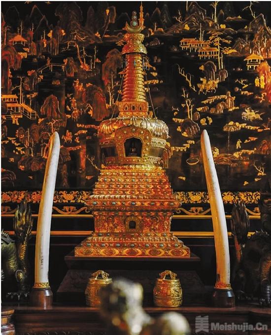 在法國楓丹白露宮之中,矗立著一座鎏金、通體各層鑲嵌著綠寶石的華麗佛塔,作為中國館中最為珍貴的藏品,圓明園青銅鎏金佛塔曾為乾隆皇帝的御用之物,被視為國之重器所珍藏。在英法聯軍侵華之后,這件藏品也被掠走,置于歐也妮皇后所建的博物館中。這件佛塔鑄造之精良、用料之華貴,不僅使其具有相當的收藏價值,也因其是世界為數不多的鎏金佛塔,而具有獨特的歷史價值。