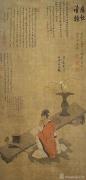 畫面中,一位身著紅衣的文士坐于桌案前,一手舉杯淺酌,一手輕按案幾,目光沉沉地落在攤開的書卷上,仿佛正與書中文字共鳴。案幾之上,瓶中插著梅竹,寥寥幾筆便勾勒出清雅的文人意趣。陳洪綬的線條古拙奇峭,人物神態(tài)刻畫尤為傳神,文士眉宇間既有飲酒的疏狂,又有讀書的沉靜,將亂世之中文人借著書卷與酒安放內(nèi)心的家國情懷與高潔氣節(jié)表現(xiàn)得淋漓盡致。整幅畫著墨不多,卻氣韻高古、意境悠遠,再加上后世孔尚任、翁方綱等名家的題跋加持,更顯厚重深遠。